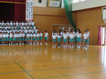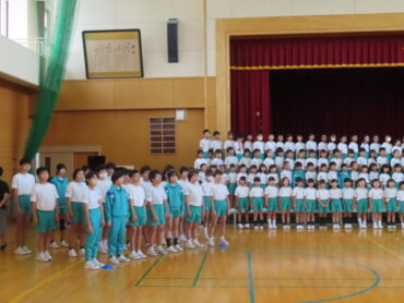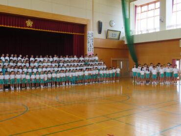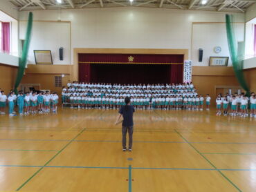 今日は、全校児童が体育館に集まり全体練習が行われました。