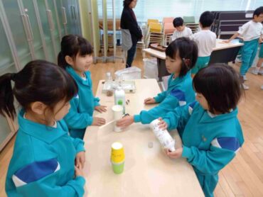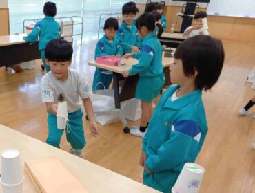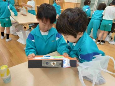 14日の学習参観では、おうちの人に楽しんでもらう予定です。それまでに「もっとたくさんおもちゃを作ろう」「難しいおもちゃに改造しよう」と考えているようです。ドングリこま、松ぼっくりのけんだま、マラカス…。みなさん、遊びに来てください。
