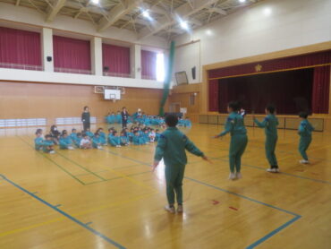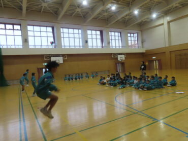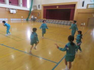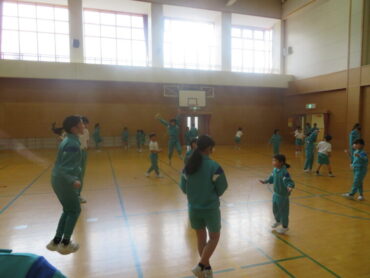 2025.11.12 1年生 5年生 6年生 5・6年生 1年生になわとびを披露しました 1学期から、休み時間に一生懸命なわとびを練習する1年生をよく見かけます。 「1年生にさらにたくさんの技にチャレンジしてほしい」、「自分たちももっと練習して跳べる技を増やしたい」という思いで、1年生になわとびを披露しました。 <5年生> <6年生> 1年生から、「おお!すごい!」という声や拍手をもらい、5・6年生のやる気もアップしました。 休み時間に1年生と一緒に練習する5・6年生もいました。 3学期はなわとび大会を予定しています。お互いに、練習をがんばっていきましょう!