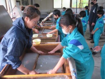午前中は、八尾町で紙漉き体験をしました。平らな紙になるように、すくい網を上下左右にこまめに動かしたり、選んだ飾りをどこに配置しようか考えて置いたりしながら作りました。金粉を振りかけ、水を蒸発させていただき、みるみるうちに素敵な和紙が出来上がりました。世界に一つだけの自分の和紙を家に持ち帰るのが楽しみですね。