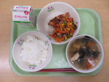 今日の給食の副菜は、6年2組の子供たちが考えた「パワーUP!にんじんしりしりin小松菜」でした。