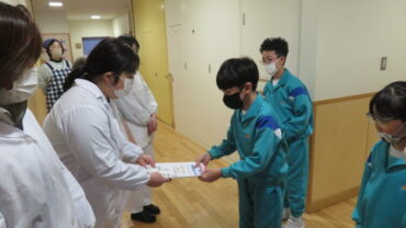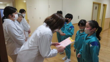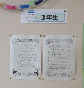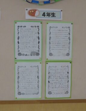 給食週間の取組として、3,4年生は調理員さんと栄養教諭の先生に手紙を書きました。今日は、各クラスの代表児童が、調理員さんに手紙を渡しました。