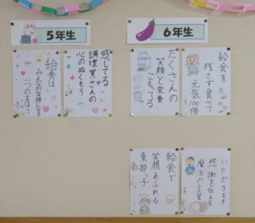 給食週間の取組で、5・6年生は給食標語を作成しました。普段何気なく食べている給食ですが、おいしく食べられることや作ってくださる方への感謝の思いがあらわれていました。