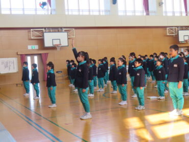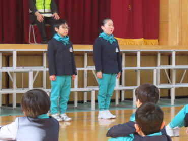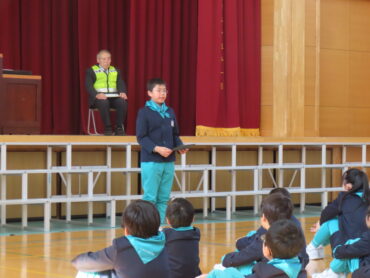 交通少年団入隊団式が行われました。交通少年団では、地域の人に交通安全を呼びかけたり、スカーフをして自分たちの安全への意識を高めたりする活動を行います。
