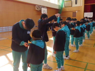 交通少年団の証であるグリーンのスカーフは、6年生から3年生へと引き継がれました。