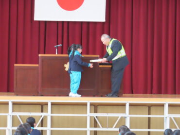 6年代表児童から送る言葉、3年代表児童から決意の言葉を述べ、交通少年団の引継ぎを行いました。