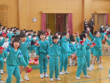 1年生の出し物では、かわいいダンスと掛け声で、6年生への感謝とエールを送りました。